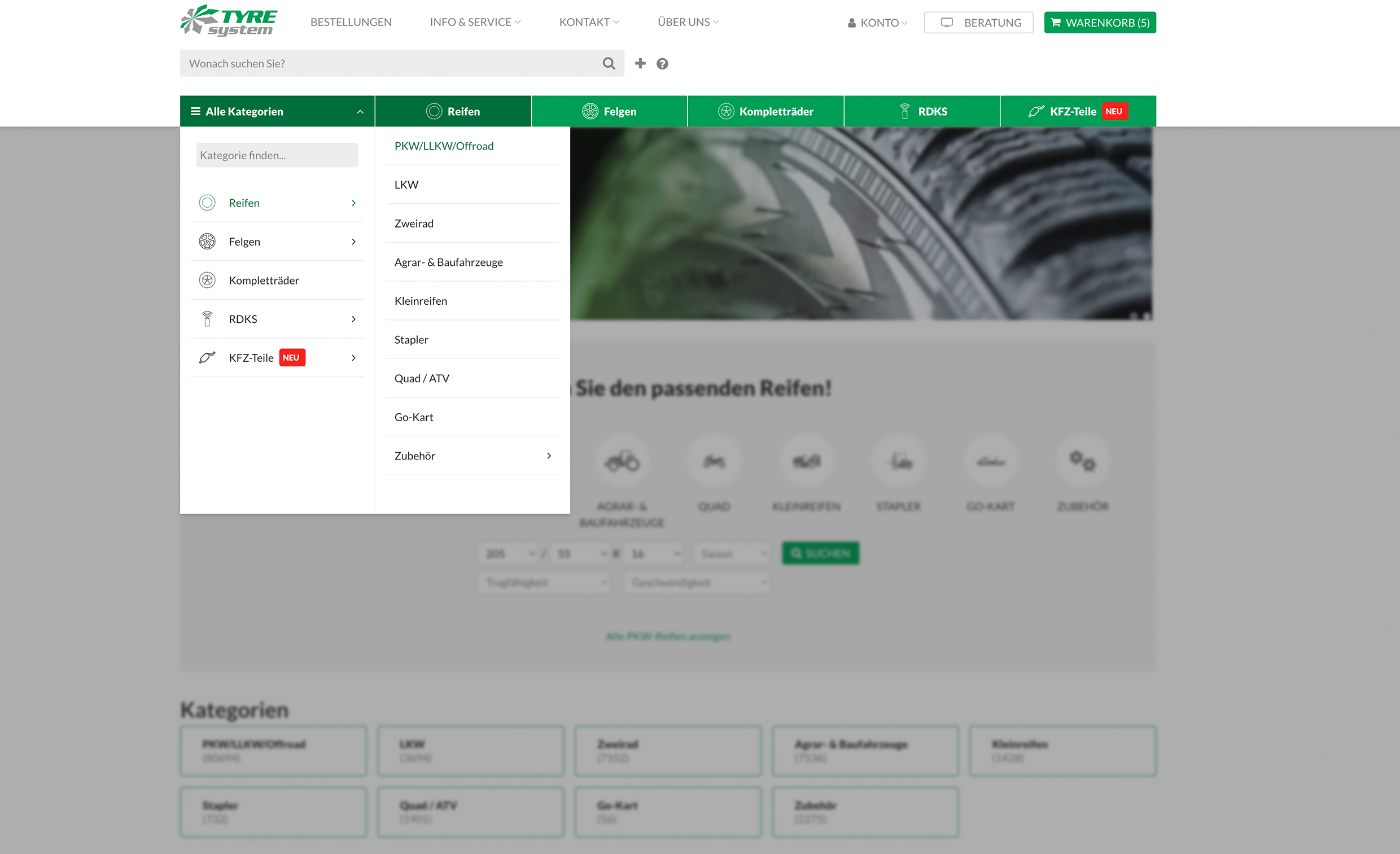 Das Update umfasst ein neues Kategorienmenü, aufklappbare Untermenüs, übersichtliche Kategorieseiten zu den einzelnen Produktgruppen und neue Filter. Ab sofort können die Kunden zwischen einem Standard- und Profifilter wechseln. Der Profifilter orientiert sich am bisherigen TyreSystem-Design, der Standardfilter ist so aufgebaut, wie der Nutzer es auch aus anderen Webshops kennt: Hier kommen Dropdown-Menüs zum Einsatz.